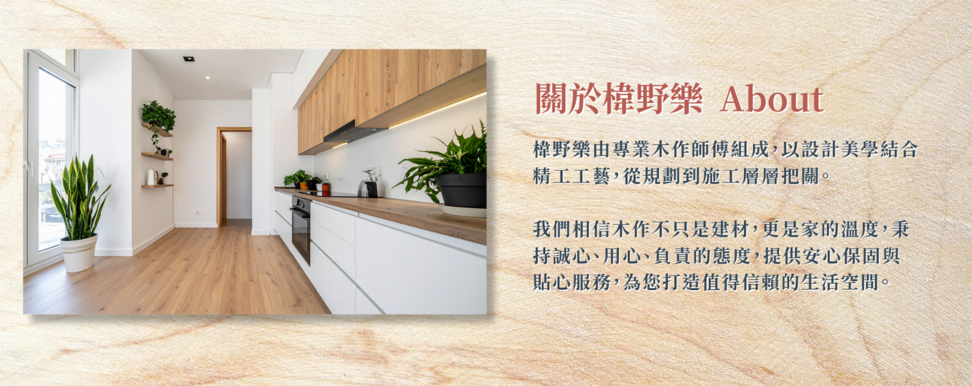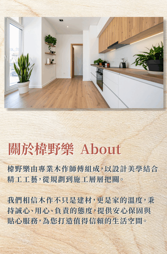 我們相信木作不只是施工,而是 空間與生活的對話秉持「誠信」、「品質」、「專業」、「準時」的核心精神,我們將細節做到最好,讓每一處木作都承載家的溫度與安心。